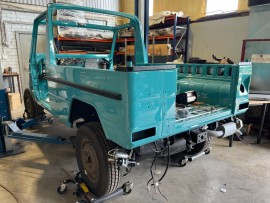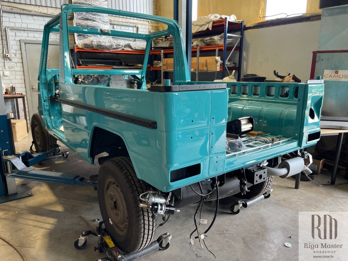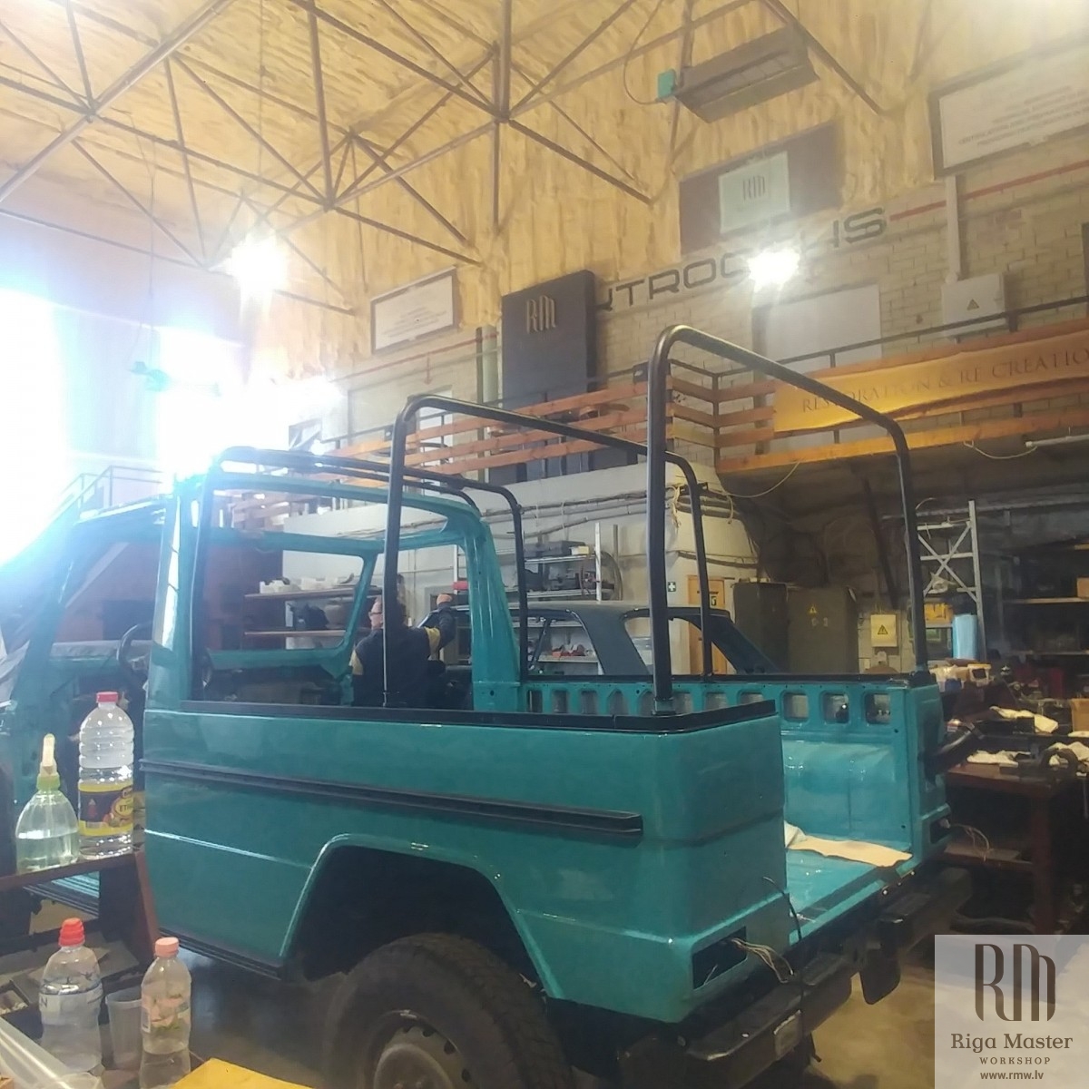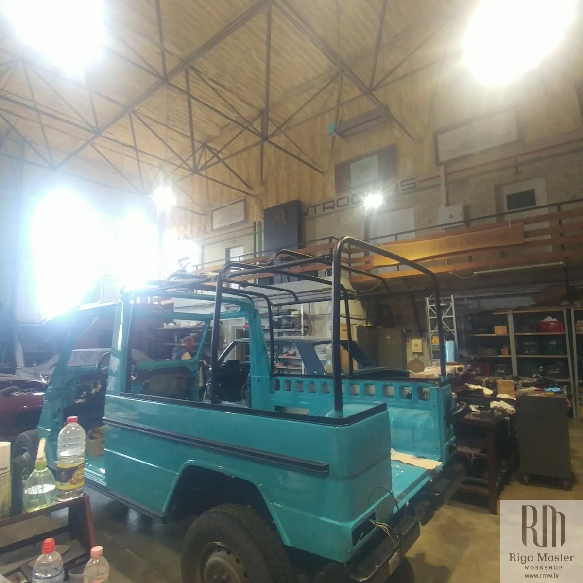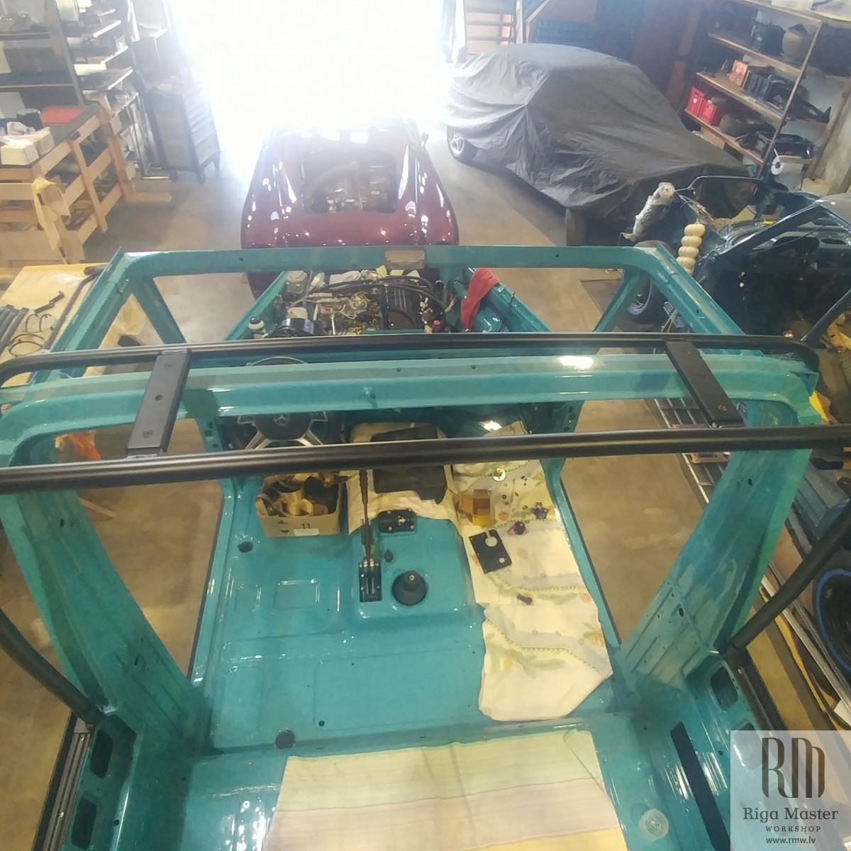 The technical reassembly phase of the Steyr Daimler Puch 230GE restoration has advanced with the installation of the external roof support structure. This week, our team focused on mounting the restored tubular frame, which serves as the primary skeleton for the soft-top roof system.