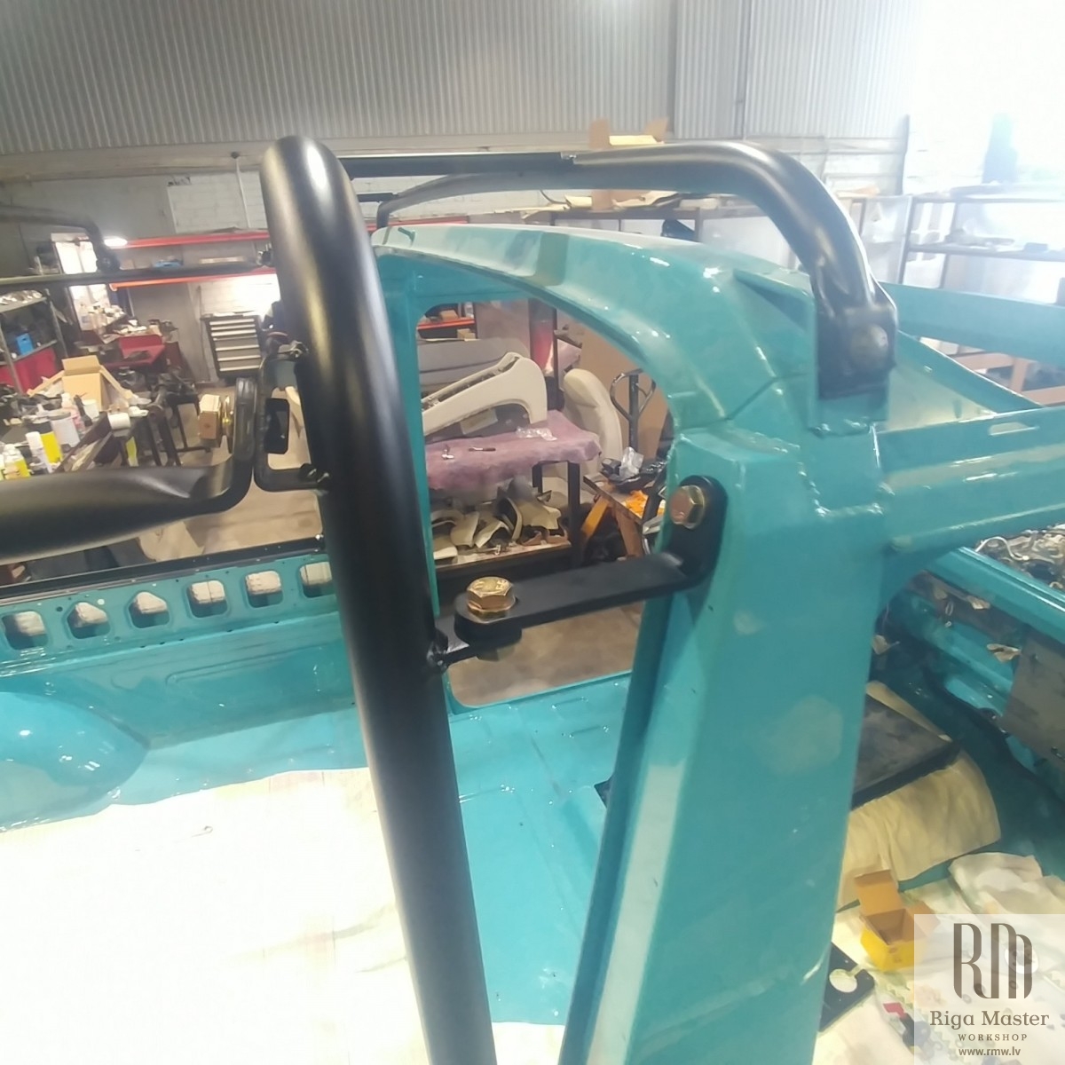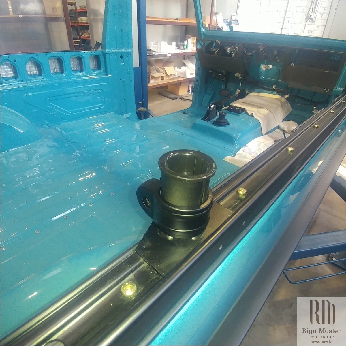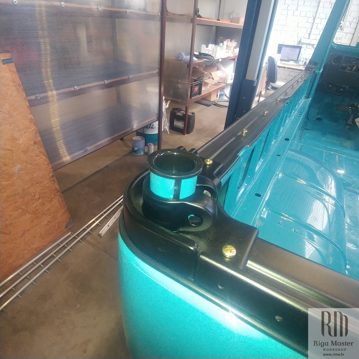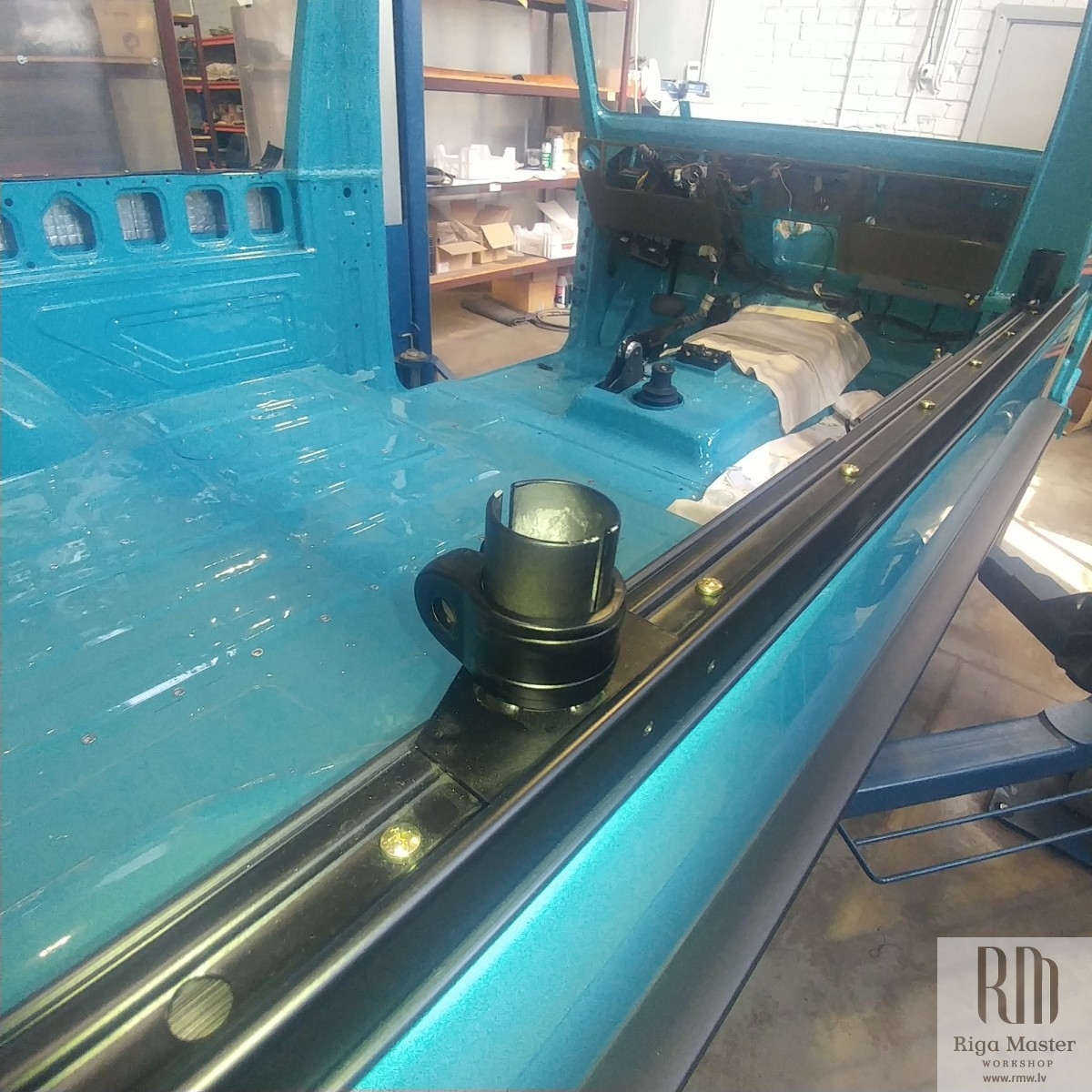 As shown in the photographs, individual components were pre-assembled and checked for alignment before being bolted to the reinforced body pick-up points. Technical attention was given to the integration of protective plastic bushings and secure hardware to ensure structural rigidity and prevent future vibration wear. This installation completes the upper body profile, allowing for the subsequent fitment of the canvas covering.