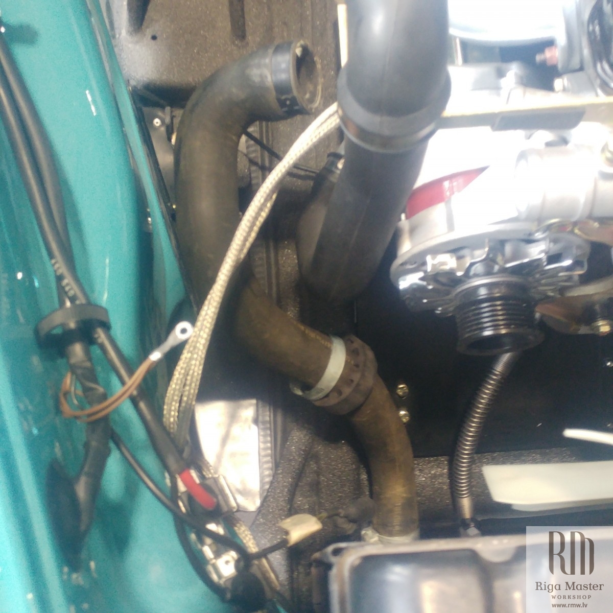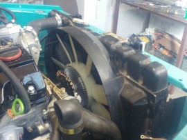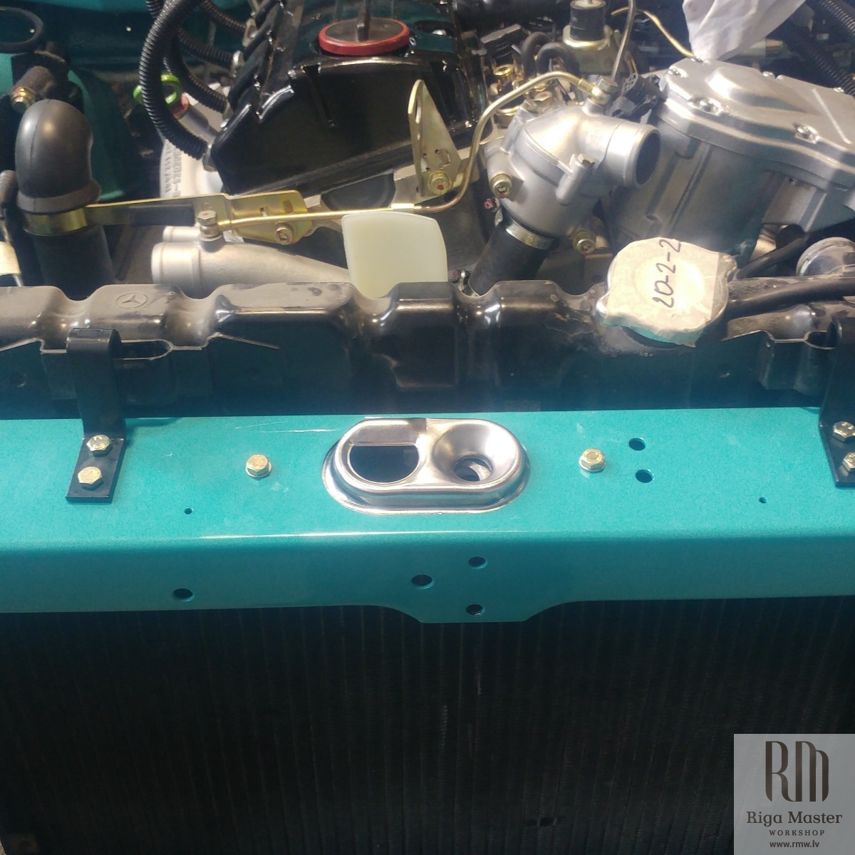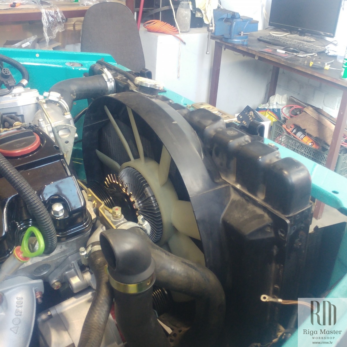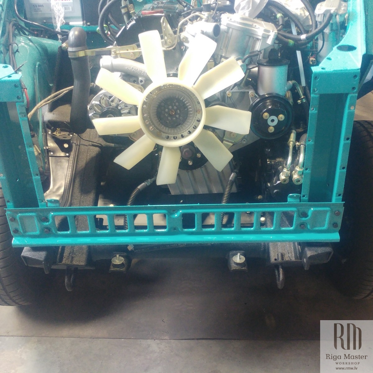 As documented in the photographs, the process included mounting the high-capacity cooling fan and securing all associated hydraulic hoses to the engine block. Technical attention was focused on the precise routing of the cooling lines and the installation of the expansion tank to ensure factory-specification pressure regulation. These completed works stabilize the vehicle’s mechanical foundation, allowing us to proceed with the final electrical and engine bay finishing.