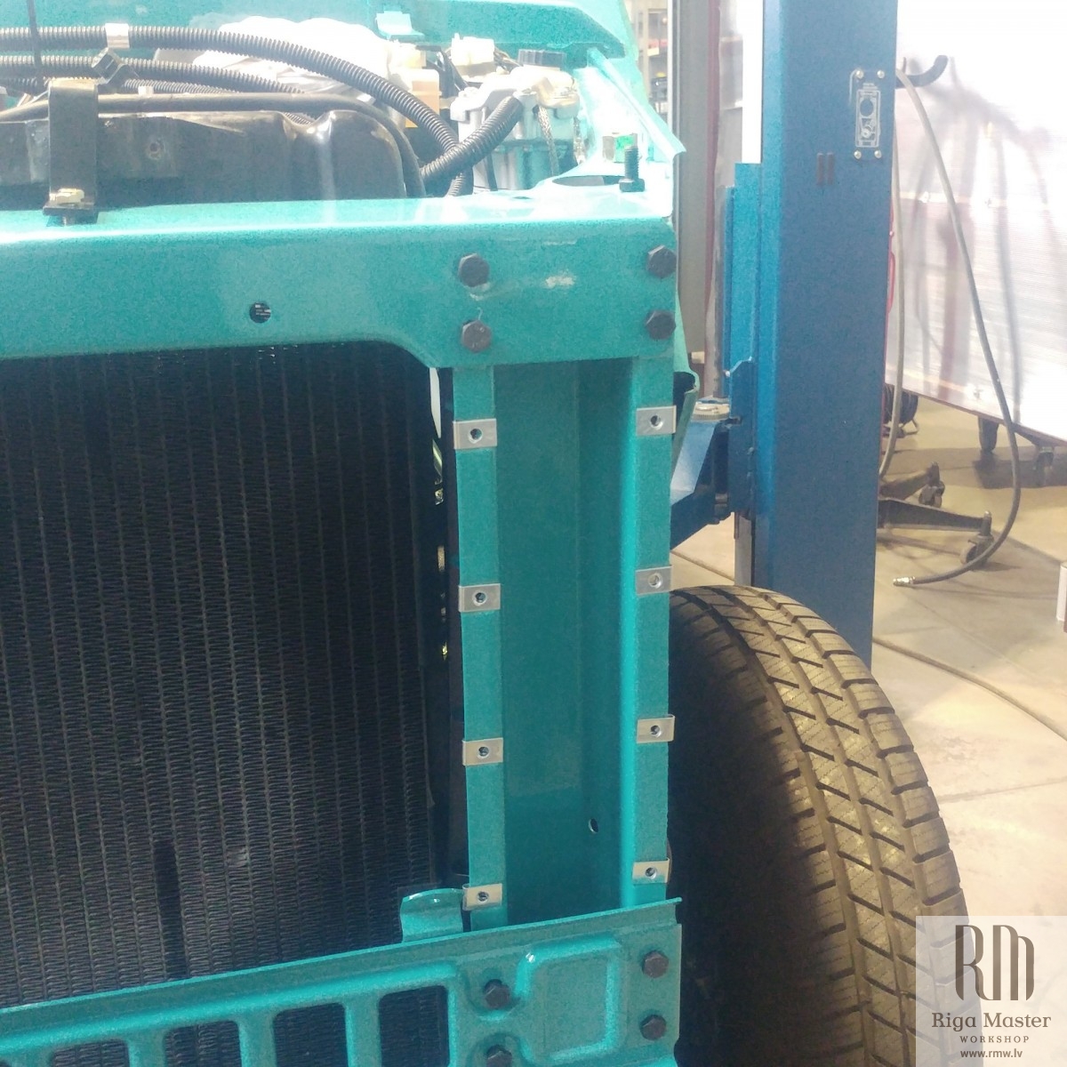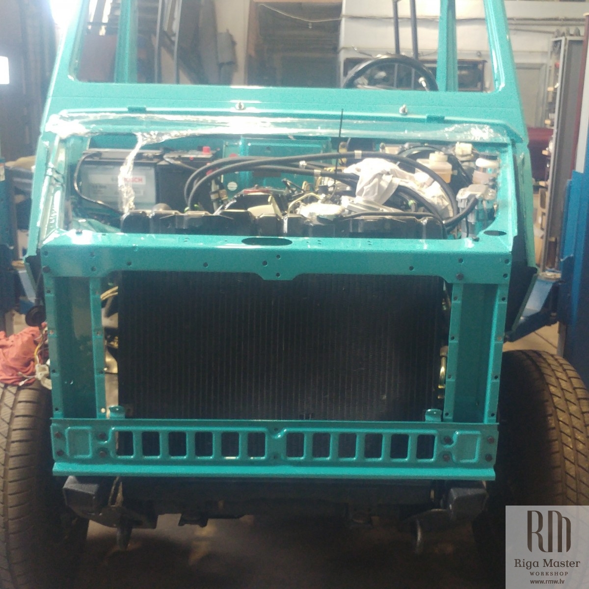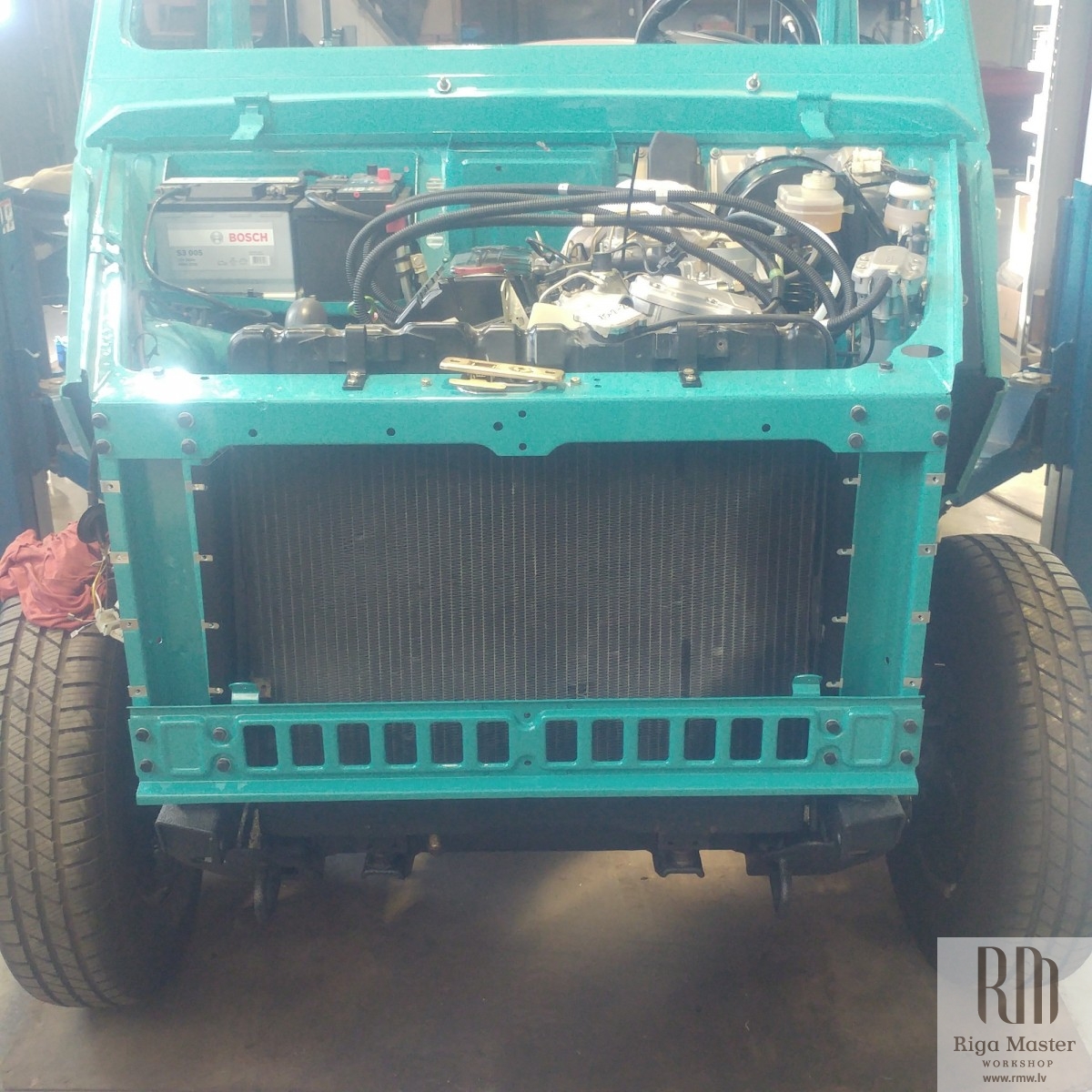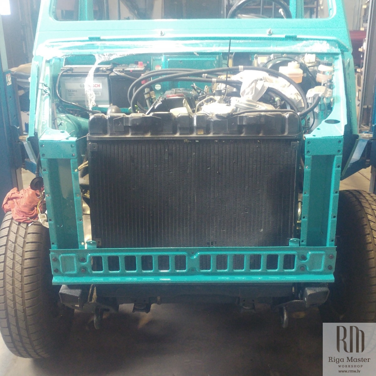 The technical reassembly of the Steyr Daimler Puch 230GE restoration has advanced to the integration of the powertrain thermal management systems. This week, our technicians successfully installed the primary radiator unit and the complete engine cooling system.