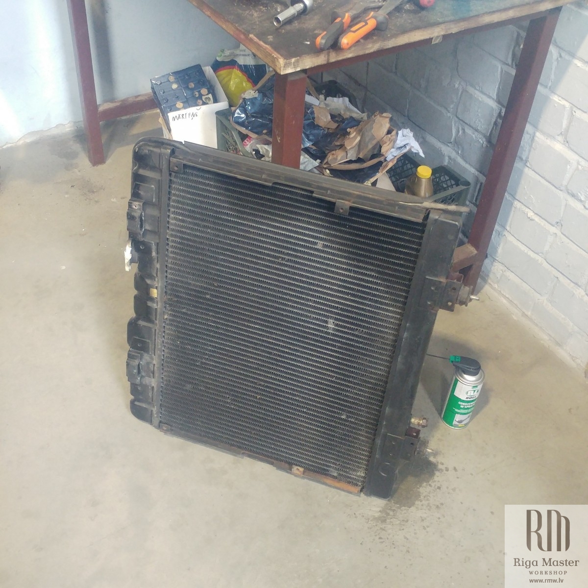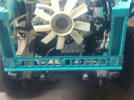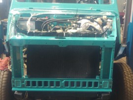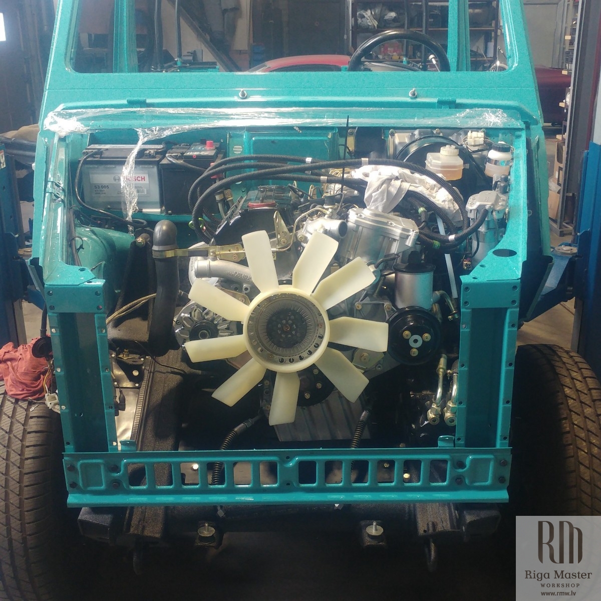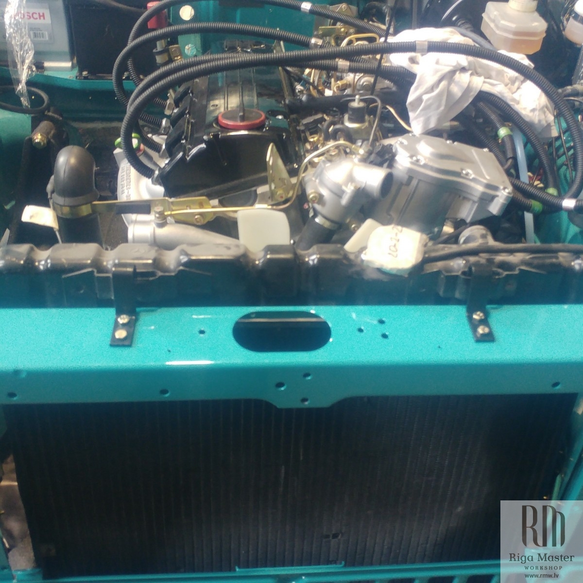 The technical reassembly of the Steyr Daimler Puch 230GE restoration has advanced to the integration of the powertrain thermal management systems. This week, our technicians successfully installed the primary radiator unit and the complete engine cooling system.