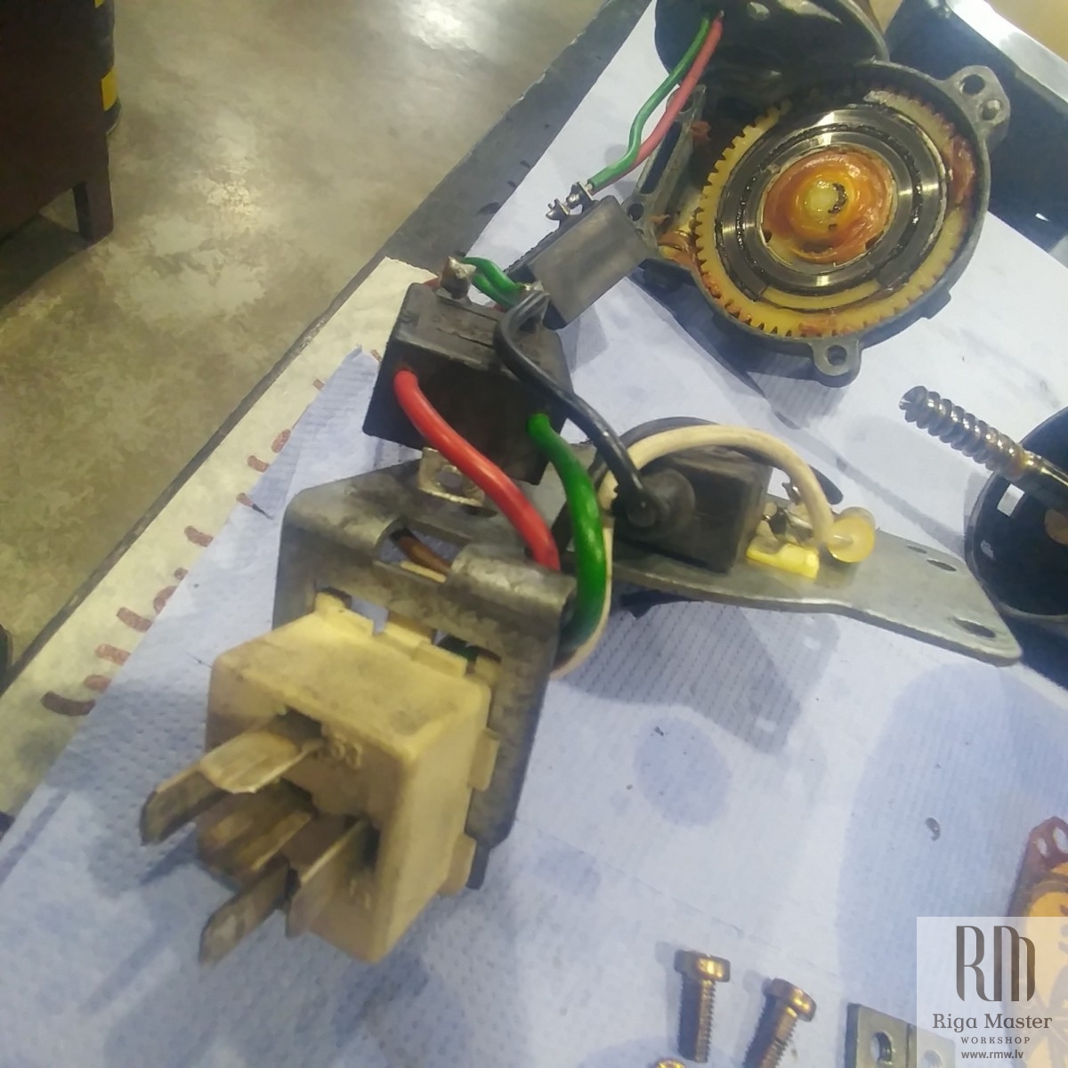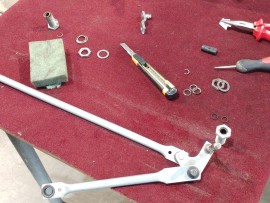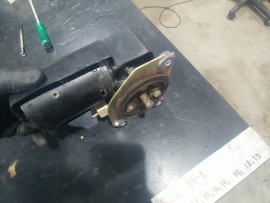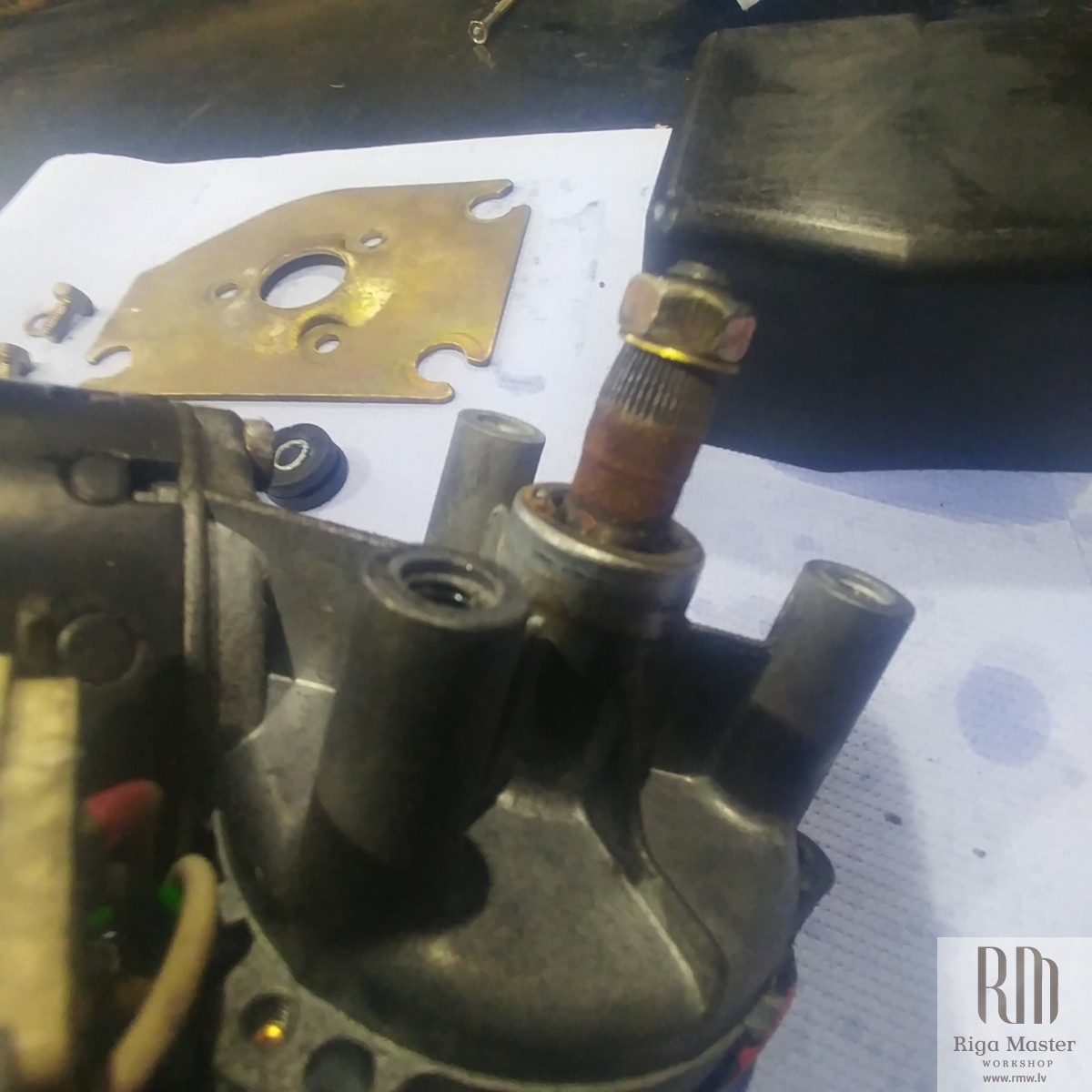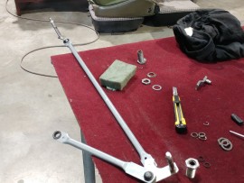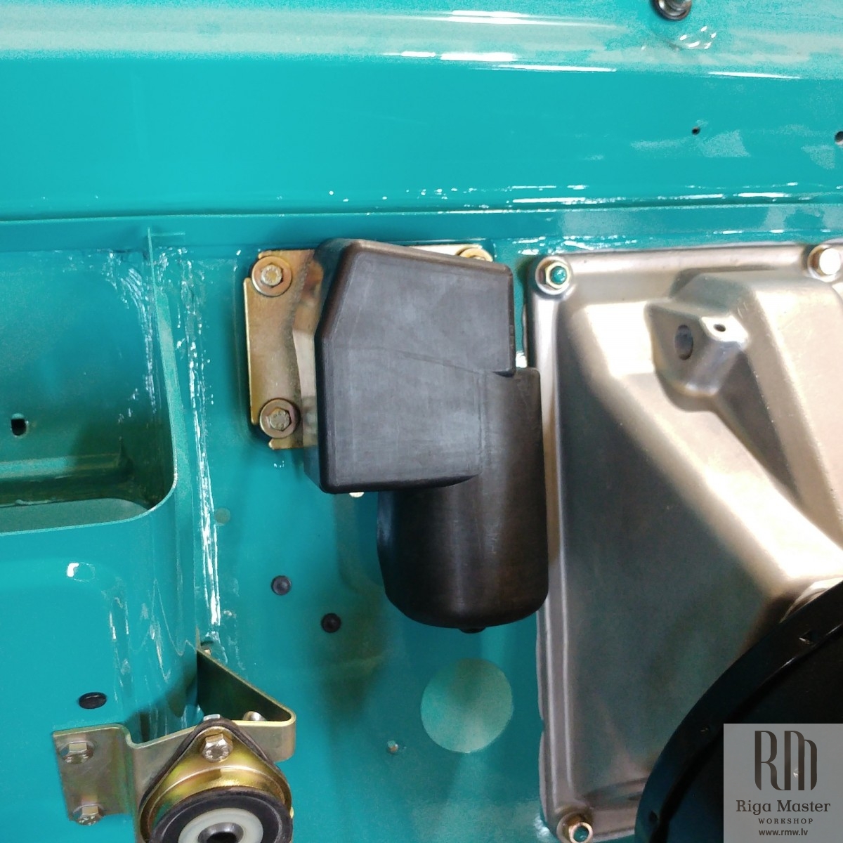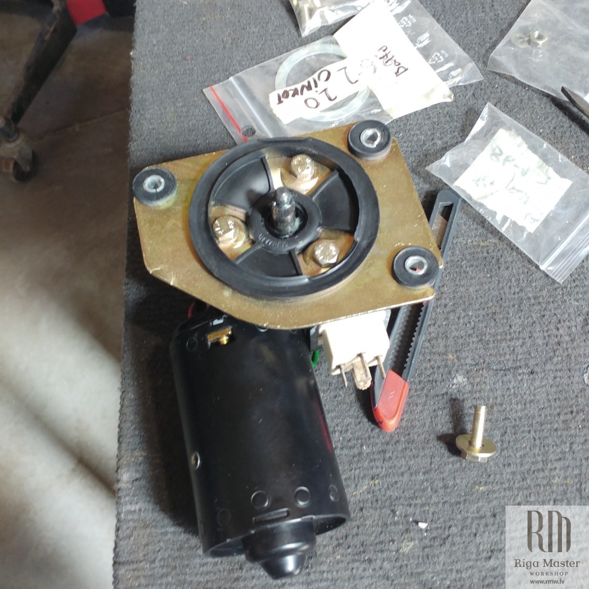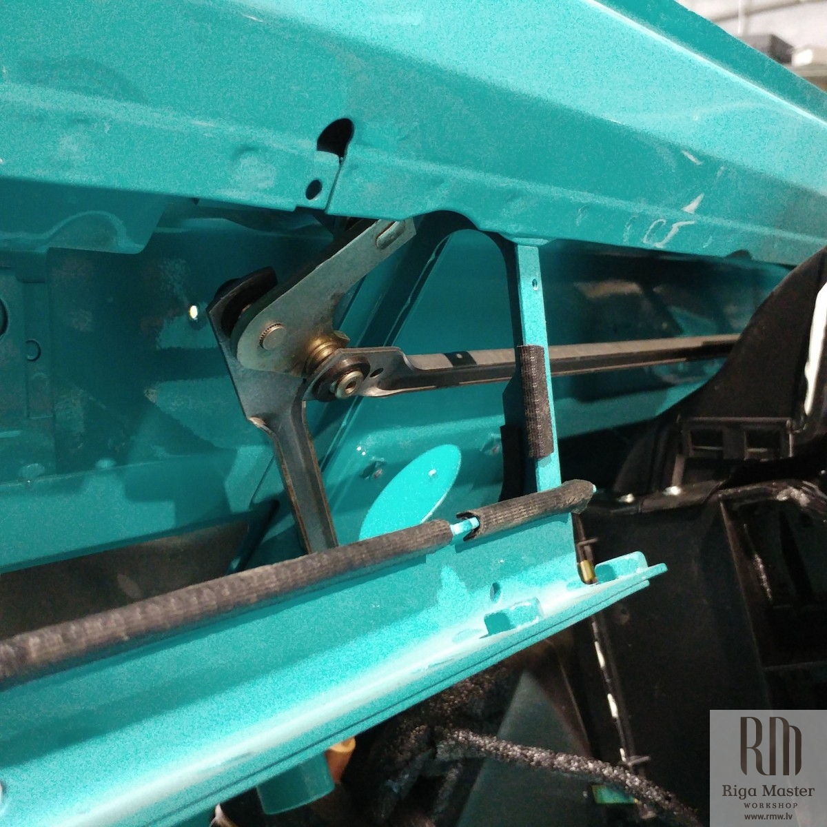 The Steyr Daimler Puch 230GE restoration at Riga Master Workshop has progressed to the wiper system. These photographs detail the complete overhaul of the wiper motor and linkage. The motor was fully disassembled, with the gearbox cleaned and re-lubricated, and components inspected (as shown by the exposed gear and wiring). The mechanism linkage arms were cleaned and prepared for reassembly. The fully restored wiper motor has now been installed into the newly painted cowl area, ensuring flawless and reliable operation of the wipers.