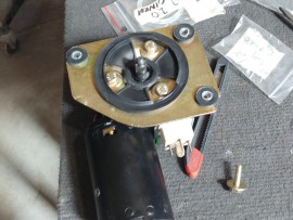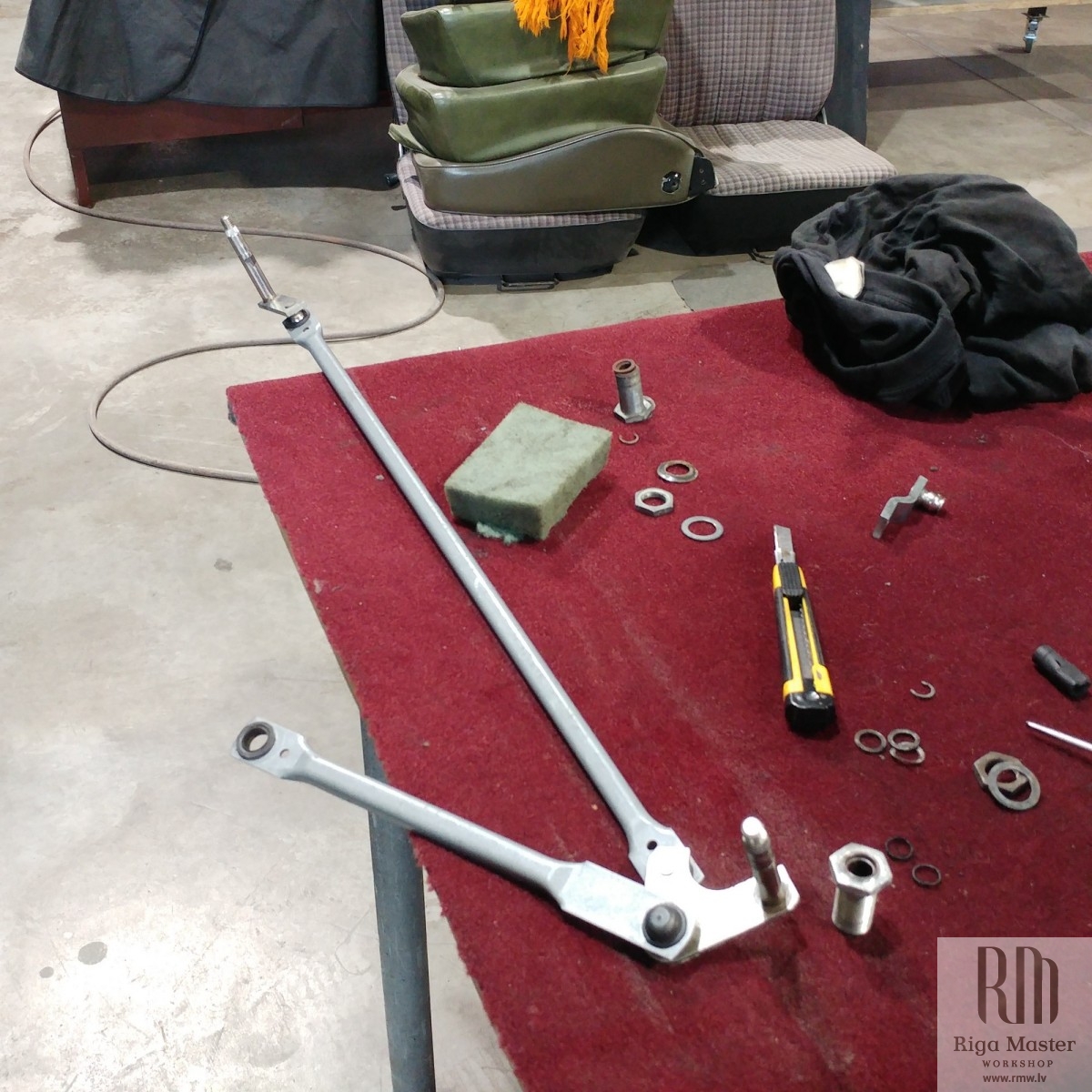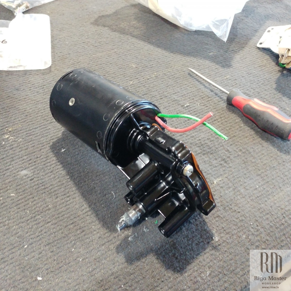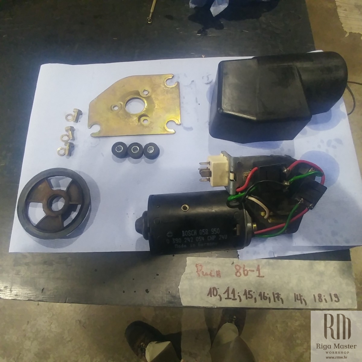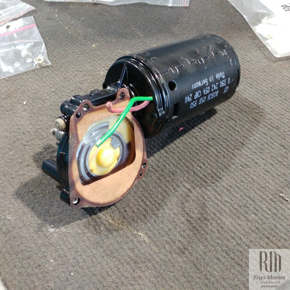 The Steyr Daimler Puch 230GE restoration at Riga Master Workshop has progressed to the wiper system. These photographs detail the complete overhaul of the wiper motor and linkage. The motor was fully disassembled, with the gearbox cleaned and re-lubricated, and components inspected (as shown by the exposed gear and wiring). The mechanism linkage arms were cleaned and prepared for reassembly. The fully restored wiper motor has now been installed into the newly painted cowl area, ensuring flawless and reliable operation of the wipers.