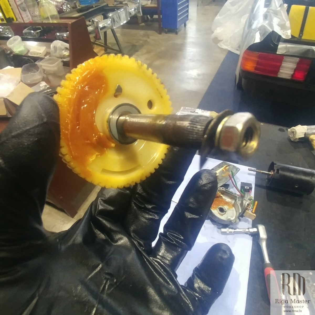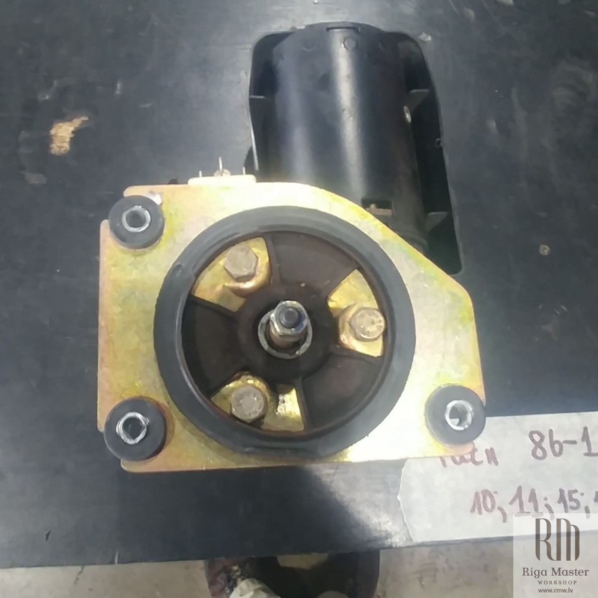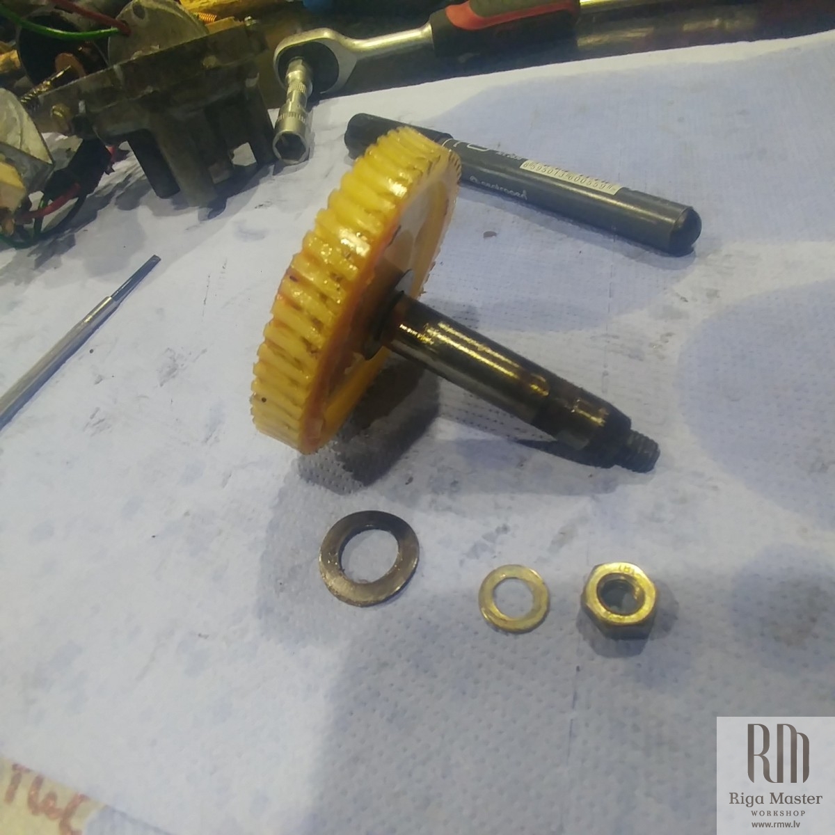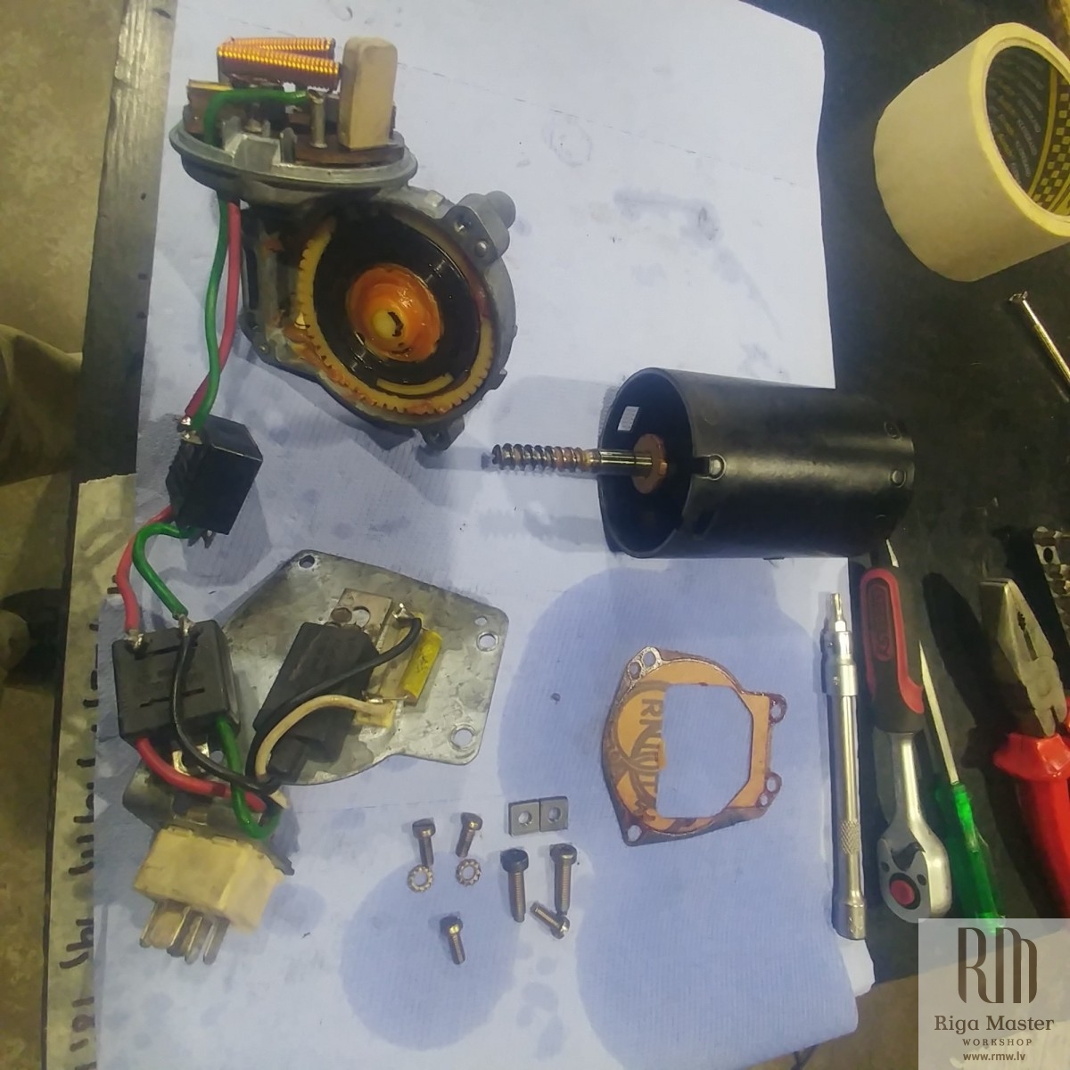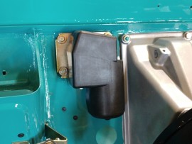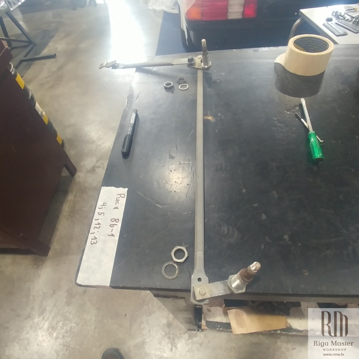 The Steyr Daimler Puch 230GE restoration at Riga Master Workshop has progressed to the wiper system. These photographs detail the complete overhaul of the wiper motor and linkage. The motor was fully disassembled, with the gearbox cleaned and re-lubricated, and components inspected (as shown by the exposed gear and wiring). The mechanism linkage arms were cleaned and prepared for reassembly. The fully restored wiper motor has now been installed into the newly painted cowl area, ensuring flawless and reliable operation of the wipers.
