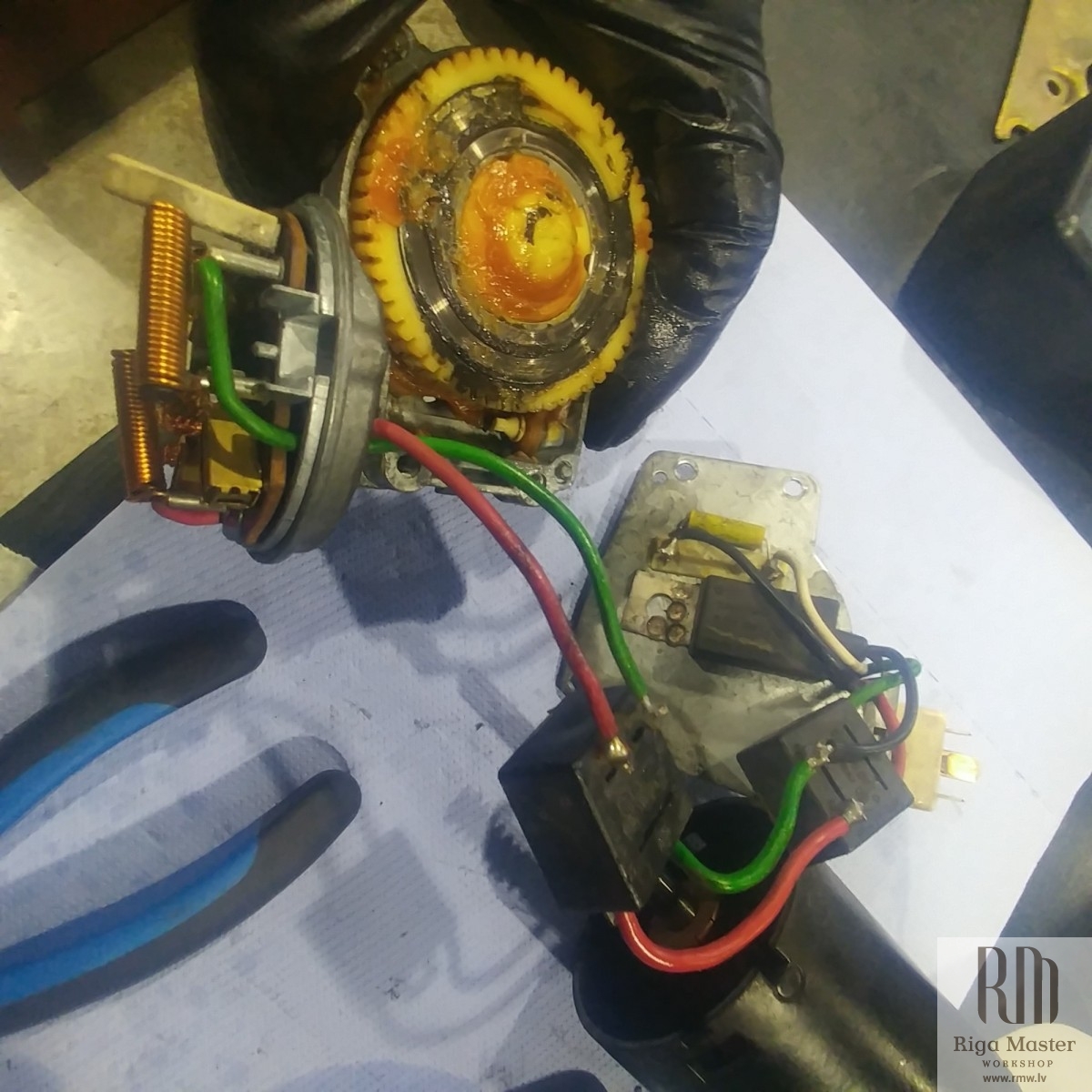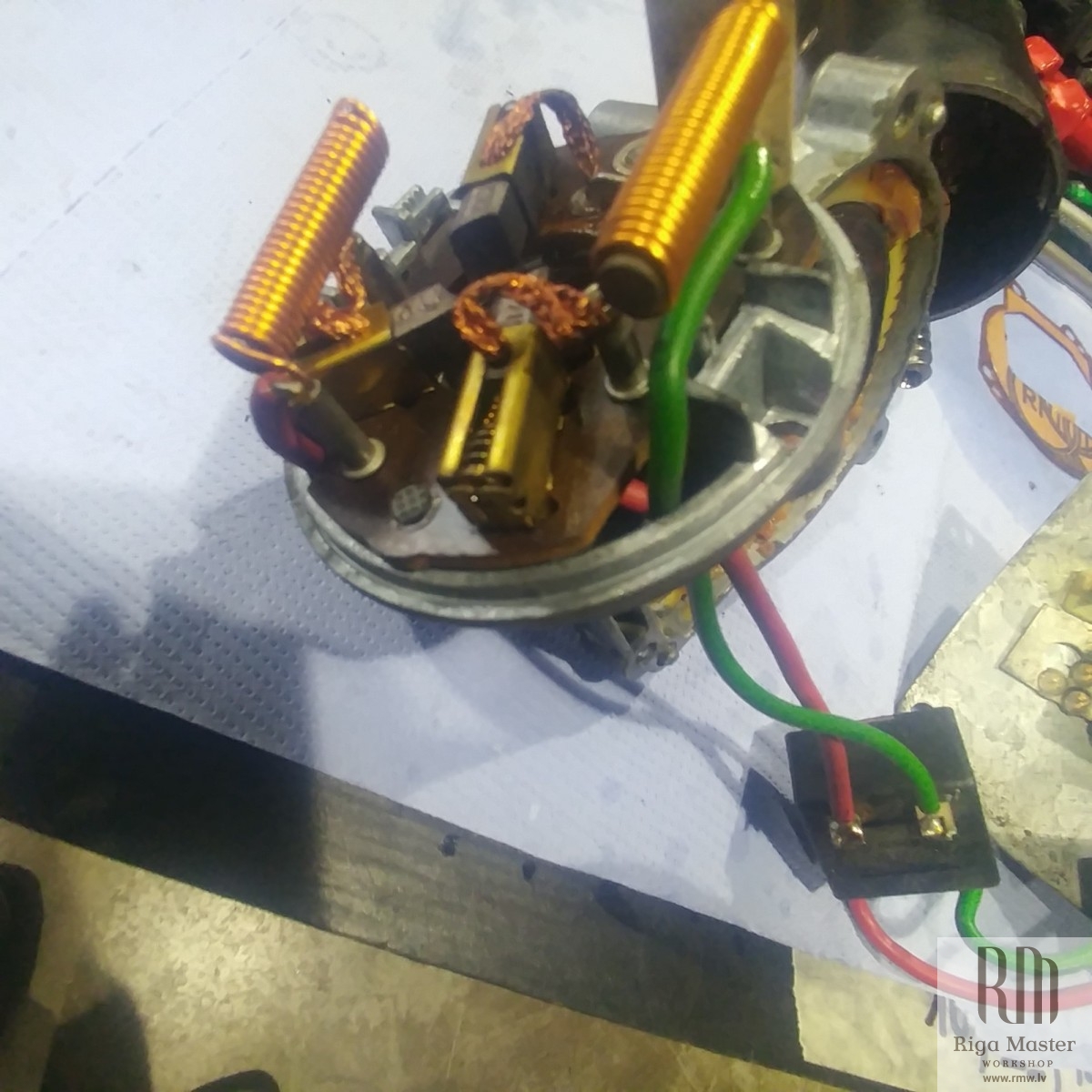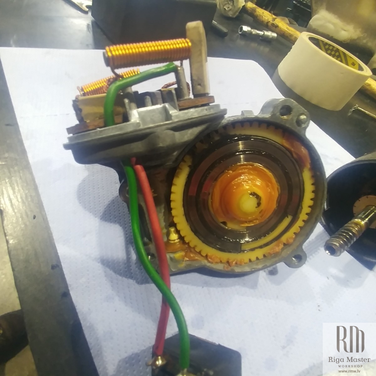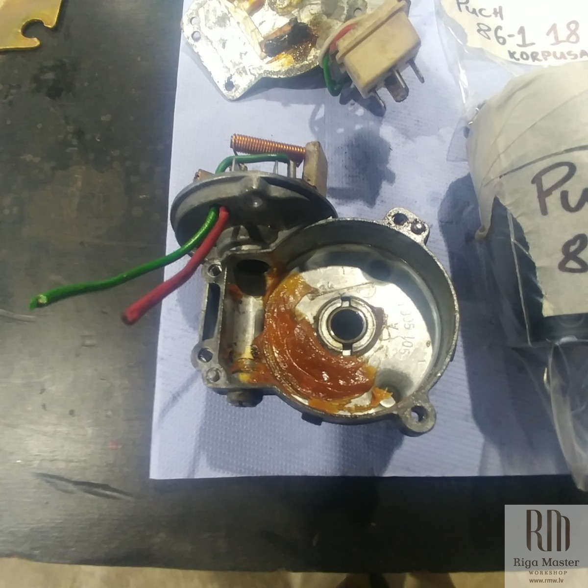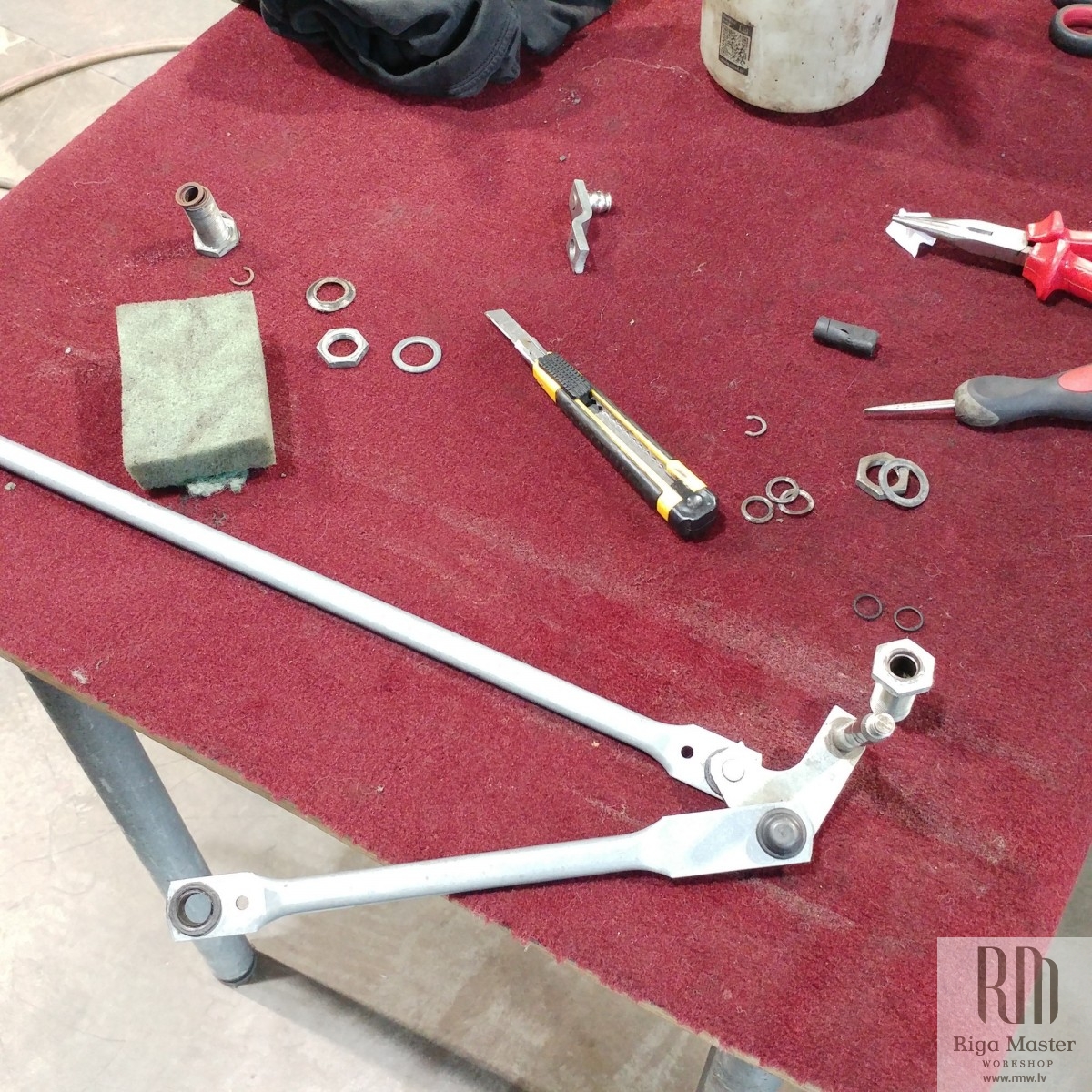 The Steyr Daimler Puch 230GE restoration at Riga Master Workshop has progressed to the wiper system. These photographs detail the complete overhaul of the wiper motor and linkage. The motor was fully disassembled, with the gearbox cleaned and re-lubricated, and components inspected (as shown by the exposed gear and wiring). The mechanism linkage arms were cleaned and prepared for reassembly. The fully restored wiper motor has now been installed into the newly painted cowl area, ensuring flawless and reliable operation of the wipers.