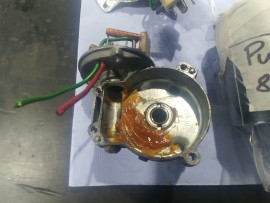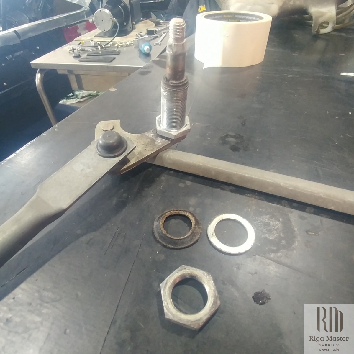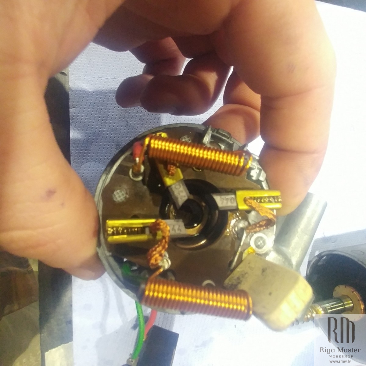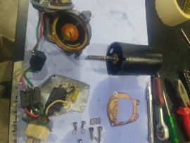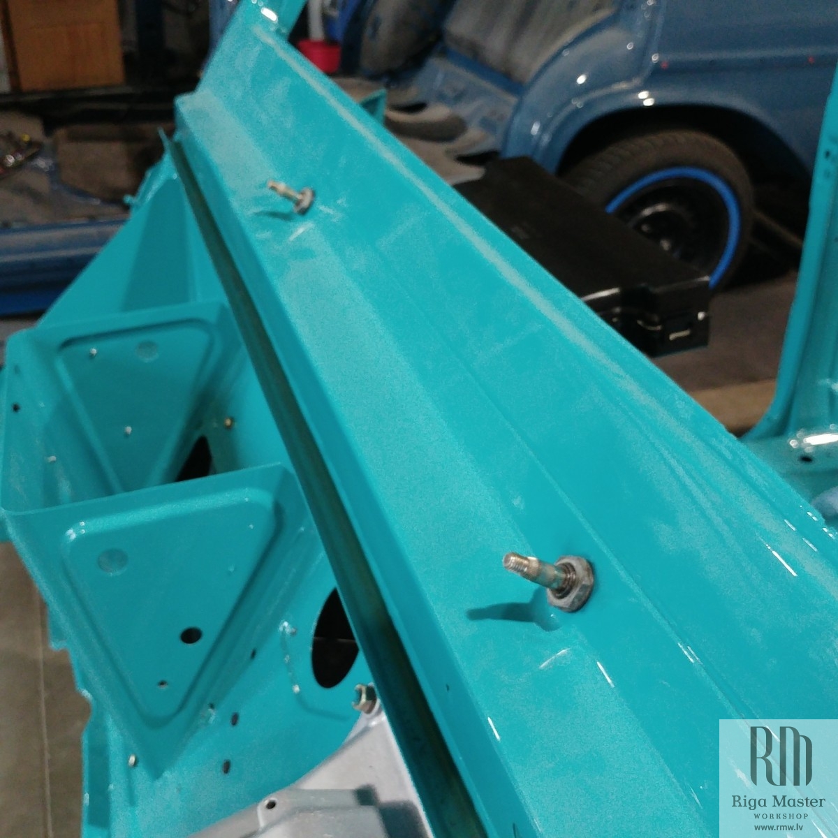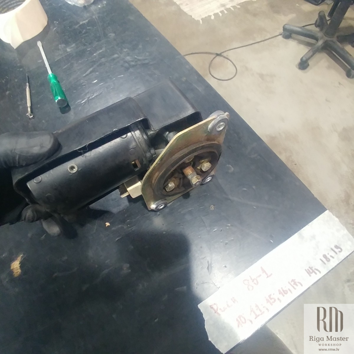 The Steyr Daimler Puch 230GE restoration at Riga Master Workshop has progressed to the wiper system. These photographs detail the complete overhaul of the wiper motor and linkage. The motor was fully disassembled, with the gearbox cleaned and re-lubricated, and components inspected (as shown by the exposed gear and wiring). The mechanism linkage arms were cleaned and prepared for reassembly. The fully restored wiper motor has now been installed into the newly painted cowl area, ensuring flawless and reliable operation of the wipers.