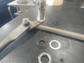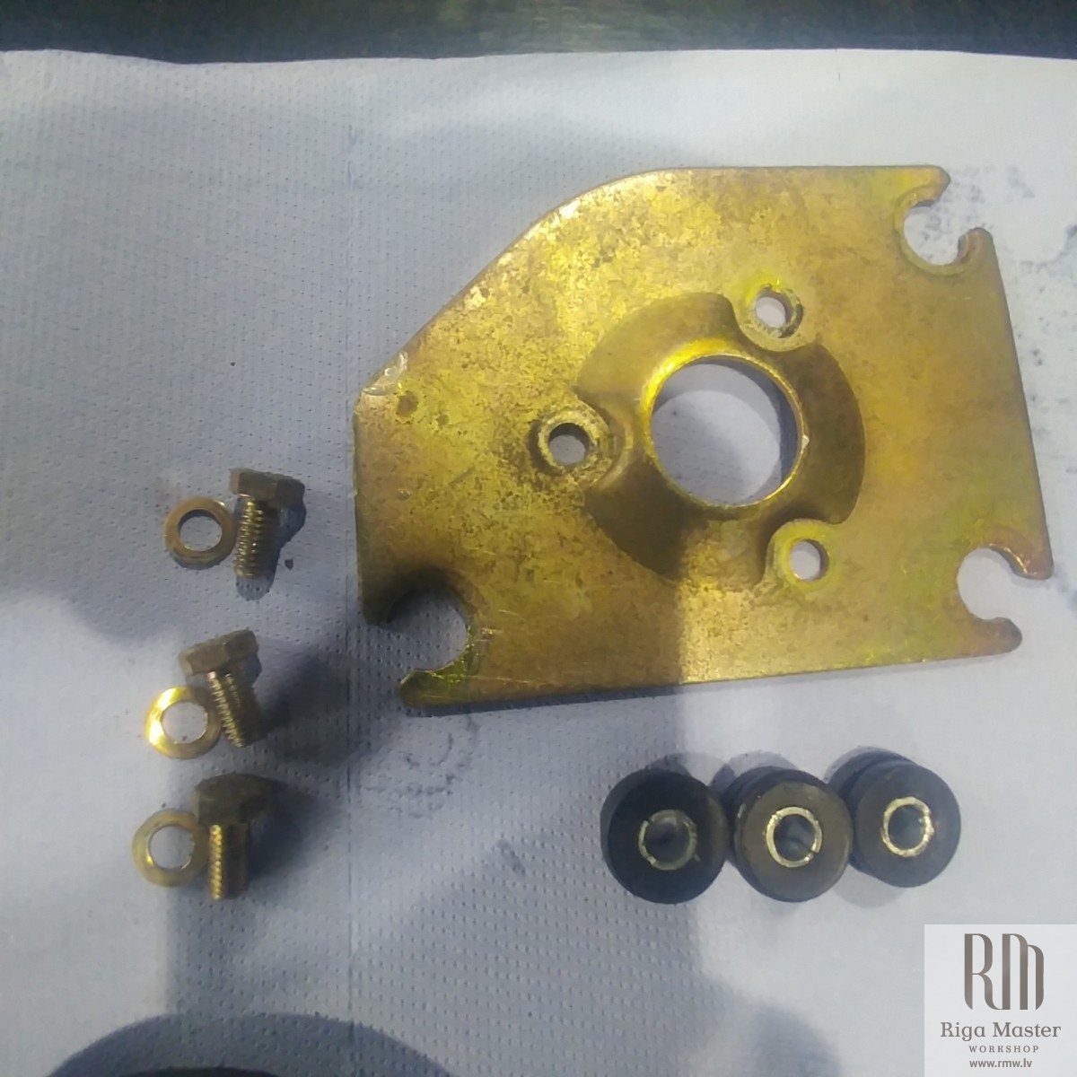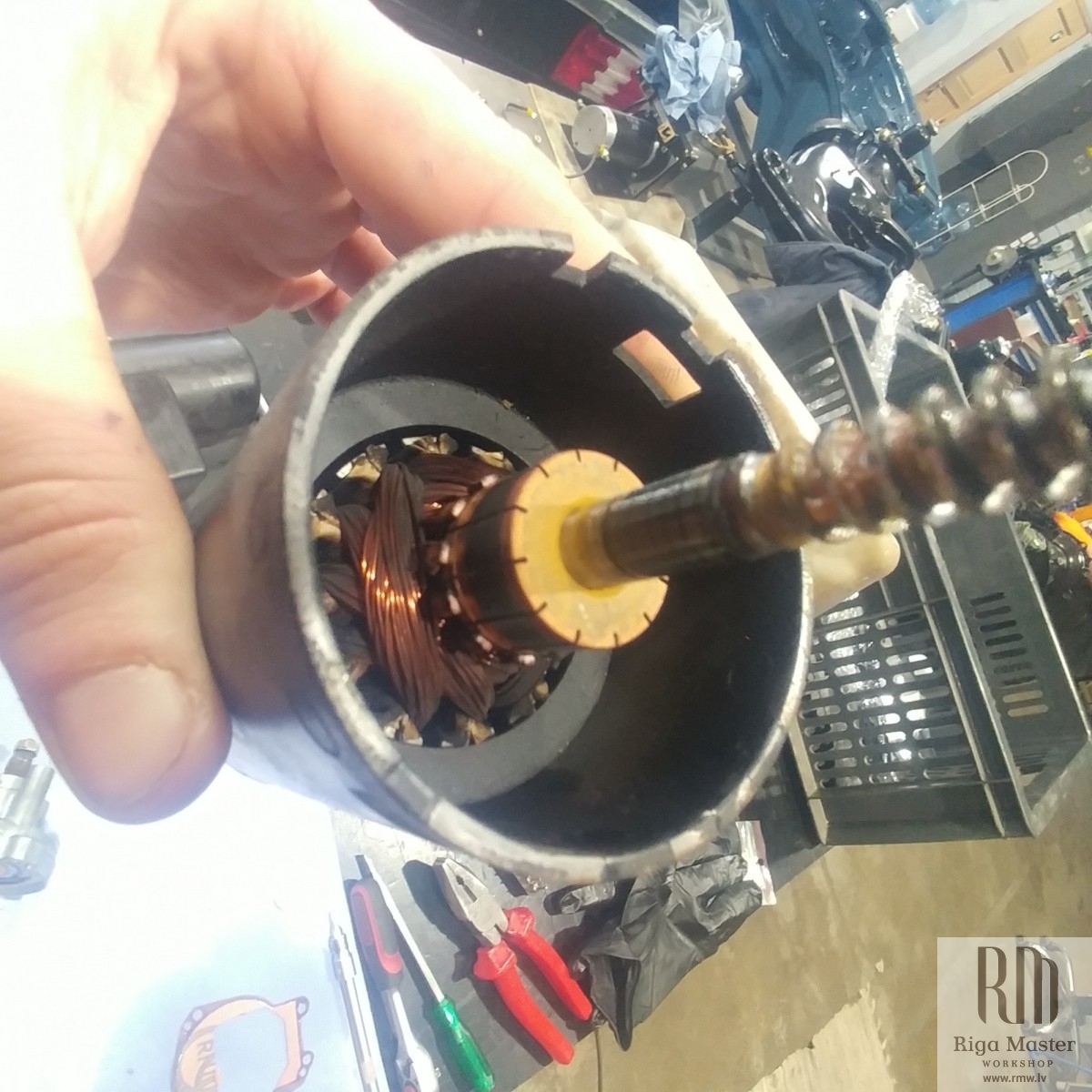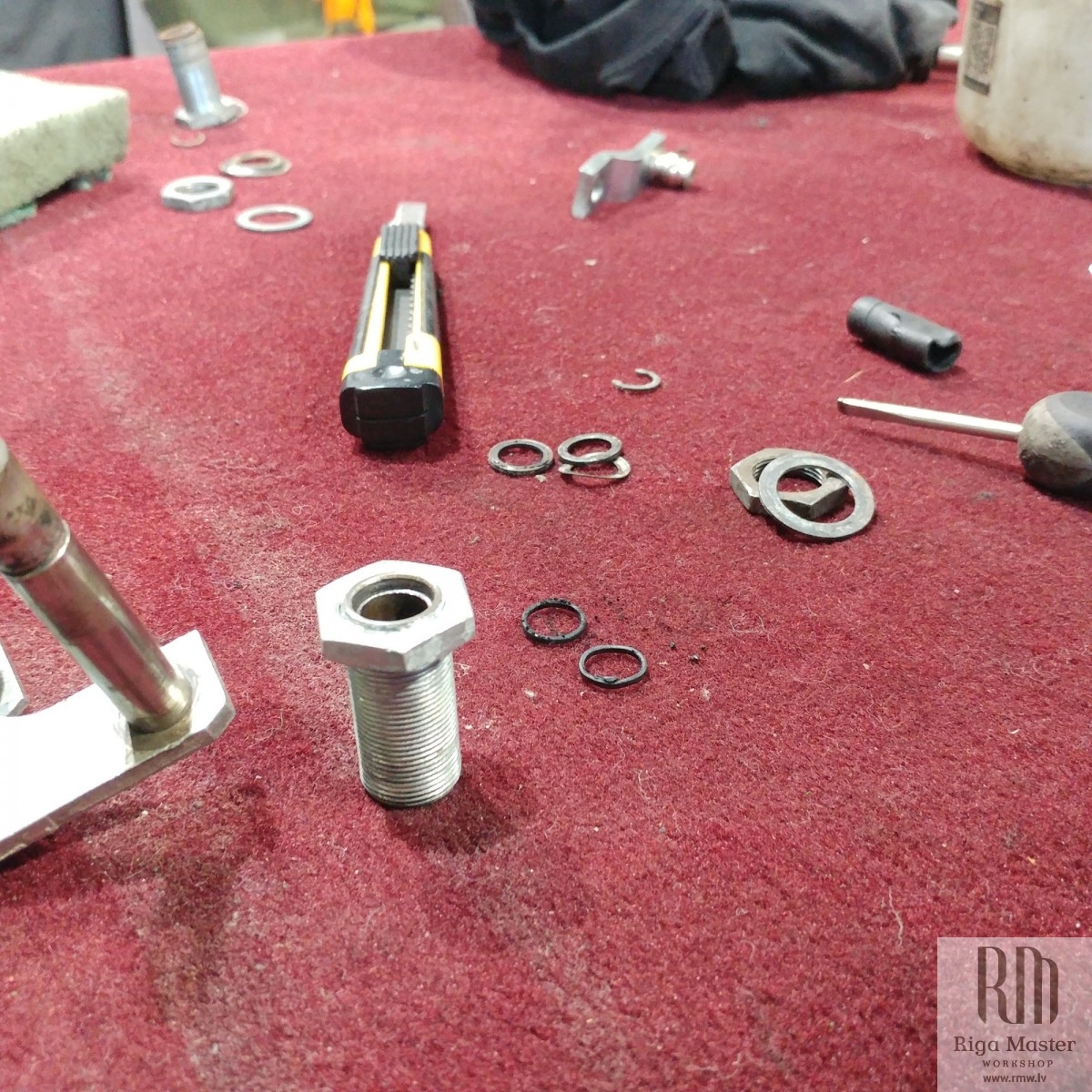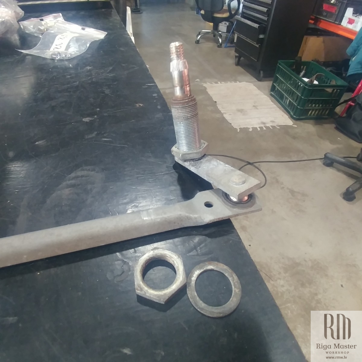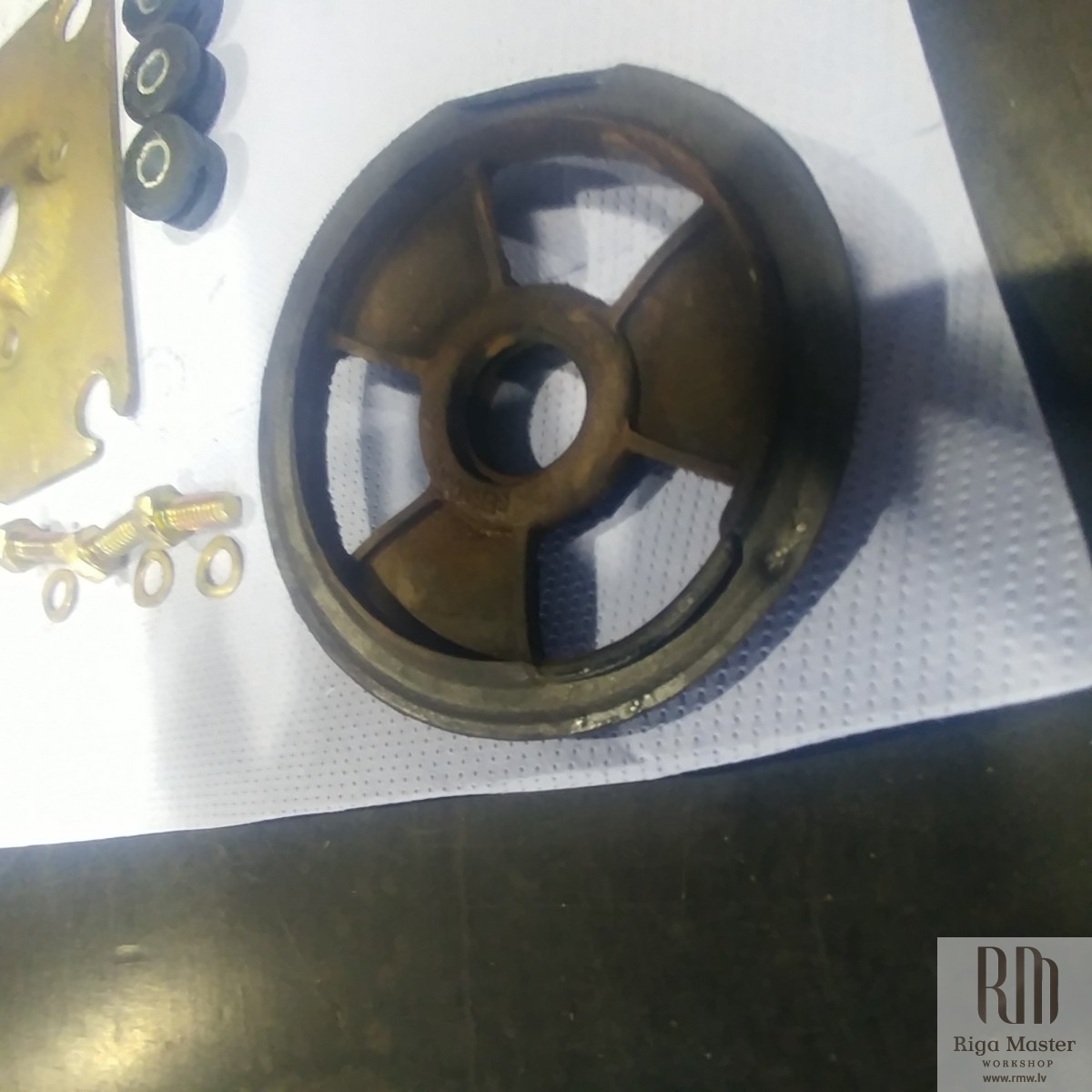 The Steyr Daimler Puch 230GE restoration at Riga Master Workshop has progressed to the wiper system. These photographs detail the complete overhaul of the wiper motor and linkage. The motor was fully disassembled, with the gearbox cleaned and re-lubricated, and components inspected (as shown by the exposed gear and wiring). The mechanism linkage arms were cleaned and prepared for reassembly. The fully restored wiper motor has now been installed into the newly painted cowl area, ensuring flawless and reliable operation of the wipers.