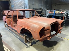 The structural Mercedes Benz 300SEL3,5 w109 1972 restoration at Riga Master Workshop is proceeding with intensive bodywork on the vehicle's front exterior panels. This week, our technicians successfully restored the front fenders, addressing localized corrosion and perforation identified on the lower trailing edges and headlight surrounds.Technical remediation involved precision grinding to bare metal, followed by the fabrication and welding of steel patches to restore the original contours. We share the photos and video to document the final surfacing and alignment of these components prior to their reinstallation on the chassis.